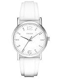 Cassa in acciaio con cinturino in silicone bianco. Risolto lunetta in acciaio inox. Quadrante bianco con argento tono mani e indice di cristallo indici. Numeri arabi segnano le posizioni 6 e le ore 12. Marcatori minuto. Il nome DNKY appare sotto la posizione delle ore 12. Movimento al quarzo. Gratta cristallo minerale resistente. Fondello solido. Diametro cassa: 36 mm. Spessore della cassa: 10 mm. Tang fibbia. Impermeabile fino a 50 metri / 165 piedi. Funzioni: ore, minuti, secondi. DKNY silicone bianco Stra vedere di piu copia rolex e Breitling Chronospace